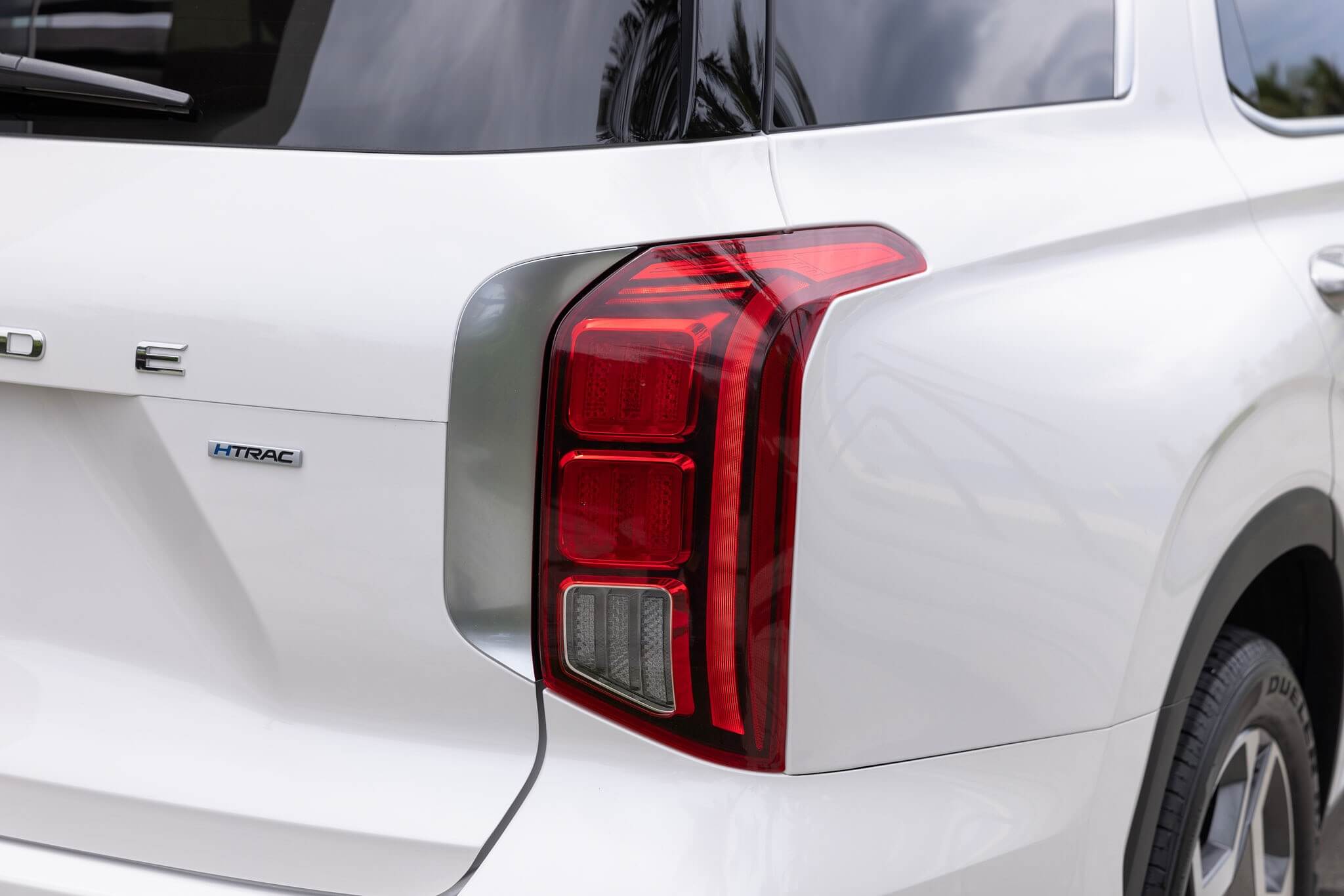 Phần đuôi xe thiết kế gọn gàng, không cầu kì nổi bật với cụm đèn hậu LED thiết kế to bản chạy dọc, kết hợp cùng bộ cản sau cỡ lớn và ống xả kép giúp tăng dáng vẻ mạnh mẽ cho xe. Cụm đèn hậu được tạo hình chữ H, đồng bộ về đường nét thiết kế với cụm đèn phía trước, giúp tăng thêm vẻ tinh tế và lịch lãm cho Palisade cùng chủ nhân.