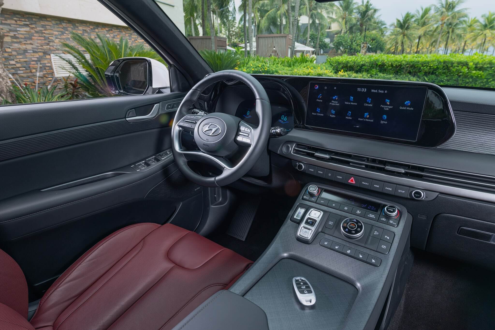 Hyundai Palisade được sở hữu không gian nội thất hiện đại, tinh tế với nhiều vật liệu cao cấp, nhằm mang đến cho chủ nhân không gian thực sự thoải mái tiện nghi với khả năng điều khiển trực quan. Xe được trang bị vật liệu da kết hợp các chi tiết vật liệu thân thiện môi trường và nhôm định hình, tạo nên một không gian cao cấp sang trọng.